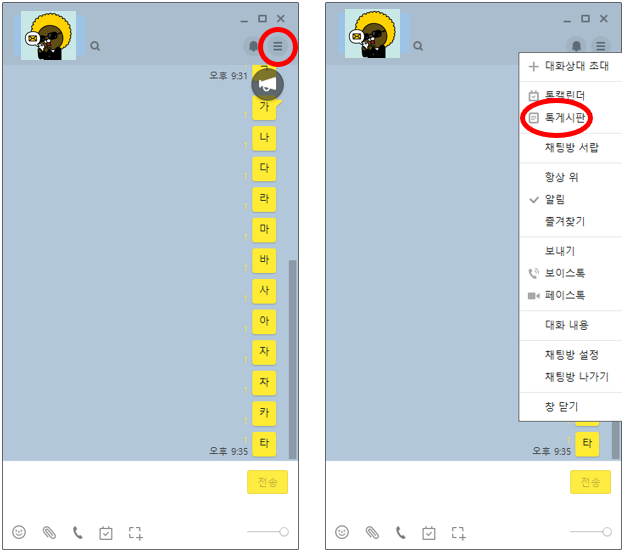 1. PC카톡 채팅방 열고, 우측 상단 메뉴 클릭
